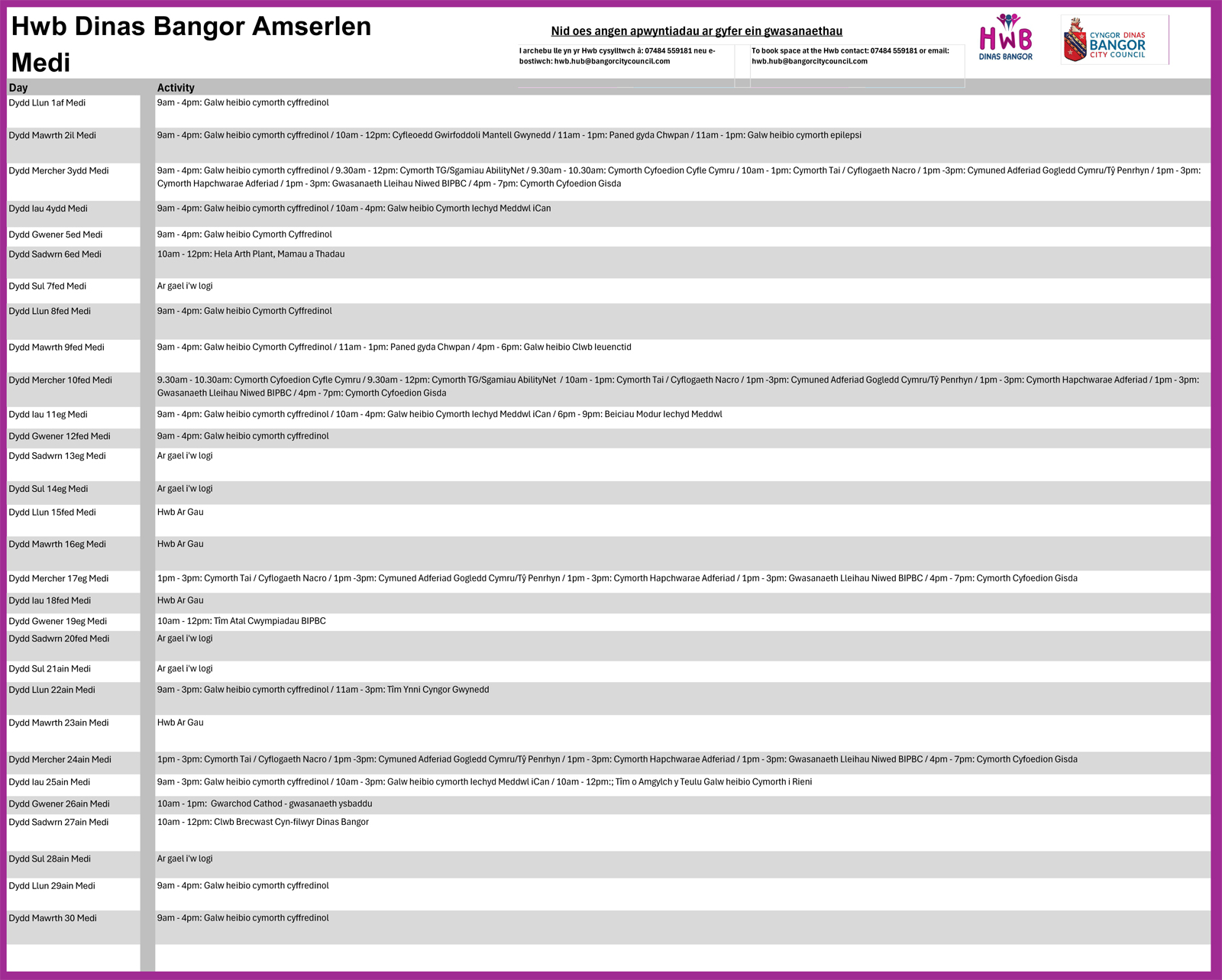 Mae'r ganolfan ar agor o ddydd Llun i ddydd Gwener, 9.30am i 4pm. Am wybodaeth neu i gymryd rhan, ffoniwch 01248 352421 neu e-bostiwch hwb.hub@bangorcitycouncil.com