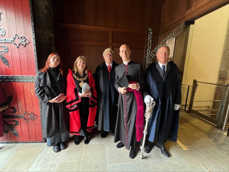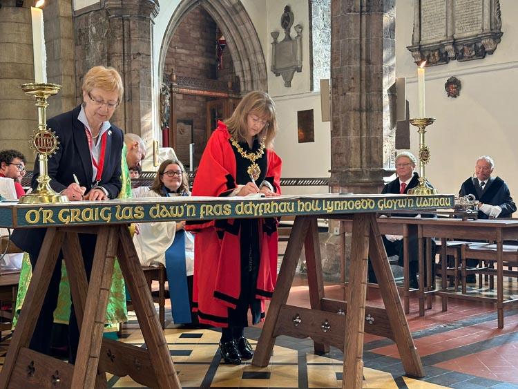 Maer Bangor Elin Walker Jones a Dirprwy Faer Soest Christiane Mackensen yn Arwyddo’r Siarteri Ailgysegru dan oruchwyliaeth Is-Ddeon Cadeirlan Bangor y Canon Sion Rhys Evans.